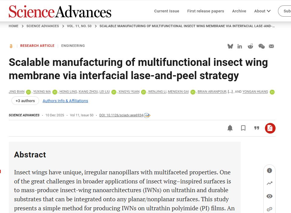 新闻网讯 12月10日,机械学院、智能制造装备与技术全国重点实验室黄永安教授团队在国际权威期刊Science Advances发表了题为“Scalable manufacturing of multifunctional insect wing membrane via interfacial lase-and-peel strategy(通过界面激光剥离策略实现多功能昆虫翅膜的可扩展制造)”的研究论文。该工作提出并发展了一种名为“界面激光剥离”(Lase-and-Peel)的制造技术,能够在超薄聚酰亚胺基底上,大规模制备出在形态与功能上与天然昆虫翅膀高度一致的人工仿生翅膜。机械学院2020届博士生卞敬、2023级硕士生马宇行、2023届硕士生凌红为论文共同第一作者,黄永安为通讯作者。