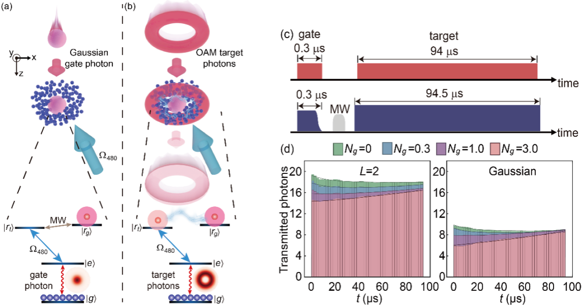 针对这一挑战,博士后廖忍等人提出并实现了一个“非局域”方案,利用环状结构光场与里德堡原子耦合,构建了“中心-环绕”的光子构型:门光子位于中心,而被操控的大量目标光子则在环绕的独立路径上传输,二者在空间上自然分离。